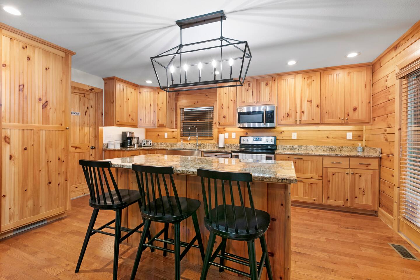 Guests have access to the entire cabin and garage, with the exception of two locked owner's closets. Please note there are steps leading up to the house from the driveway, and this is a 3-story cabin with stairs to the upper and lower levels.