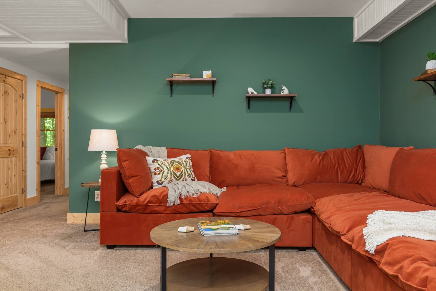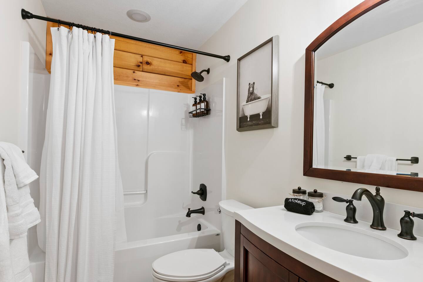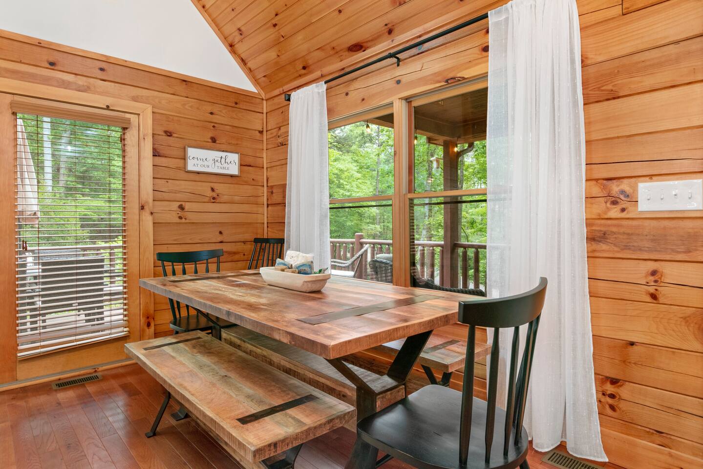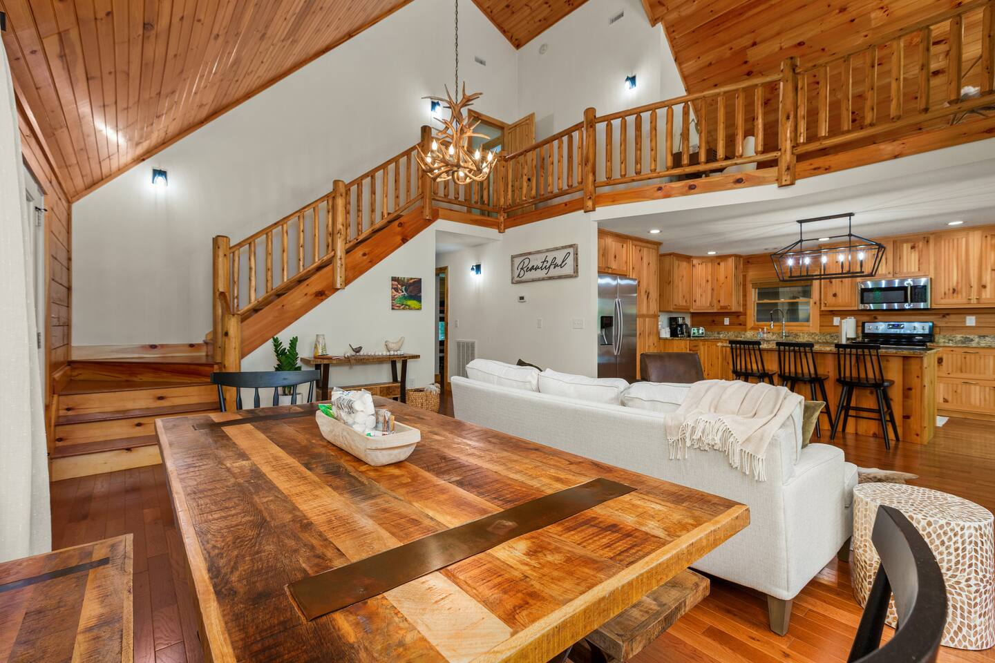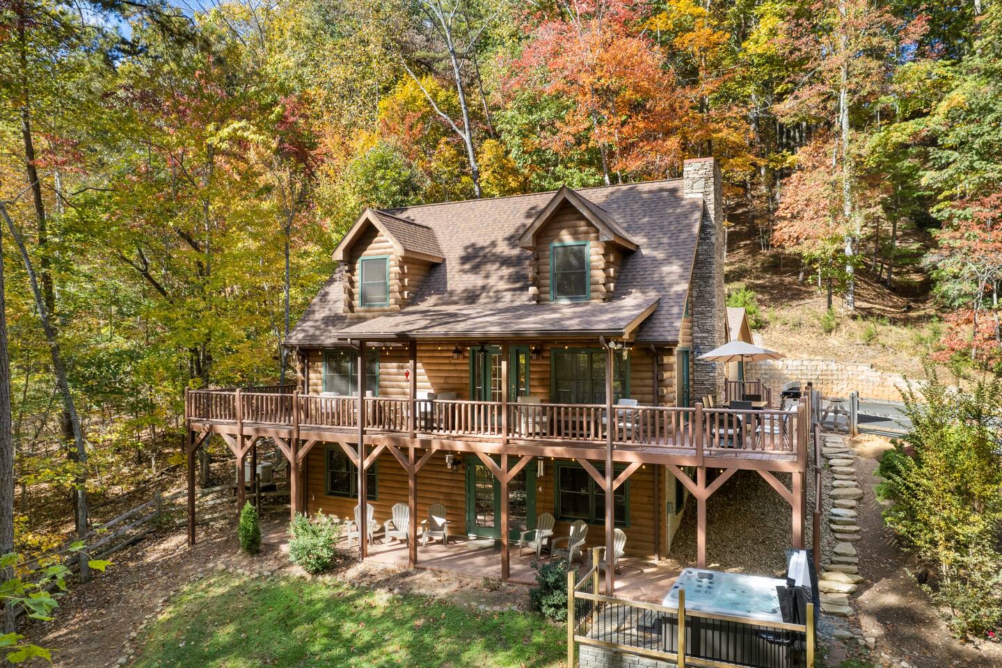 Woodhaven cabin is a perfect space for large groups and family get togethers. There are 4 bedrooms, including 2 Kings, 1 queen room, a bunkroom with 2 sets of bunk beds and a queen sleeper sofa in the downstairs entertainment room - all with memory foam mattresses. Room for all: the 3-story cabin has room for everyone to spread out and enjoy activities from the open living dining space and spacious kitchen on the main floor, to the upstairs master suite, loft and workspace, to the lower level entertainment room with pool table, giant sofa and massive 85" tv with sound bar. Kitchen: if you like to cook, you'll love this kitchen! It is fully stocked with service for 16, sharp knives, cookware and baking necessities, assorted stemware, small appliances, a well stocked pantry , kitchen staples, and a coffee and tea bar with multiple options: coffee maker, pour over, Chemex, electric kettle, coffee bean grinder. Coffee beans and assorted teas. Outdoor spaces: Our large deck wraps around 3 sides of the cabin, providing ample space for outdoor dining and grilling, roasting marshmallows around the gas fire pit, and several spaces for lounging on the deck overlooking the yard. There's no better place to observe the local wildlife. The lower level houses the 6-person hot tub and additional seating on the lower patio. Amenities: the house is equipped with two HVAC systems to keep you comfortable year-round. You'll find smart tvs in the master suite, main level living room and the massive 85" tv in the lower level entertainment room which also houses the pool table and poker table. French doors open from the entertainment room to the lower level patio and hot tub. You'll find board games, puzzles and books for all ages throughout the cabin to keep everyone entertained. Rumbling Bald Guest Passes: our guests receive 10 Rumbling Bald Guest passes which provide free access to Rumbling Bald's many activities including the private beach and cabana, boat launch, tennis, pickleball and basketball courts, indoor and outdoor pools, sauna, mini golf, salon, spa, golf and restaurants. Some activities have additional fees, such as golf, kayak, paddle board rentals and mini-golf. Be sure to check the Rumbling Bald website for current activity and rental fees. Parking: you'll have access to the 2-car garage and there is space for 3 additional vehicles in the driveway and turnout.